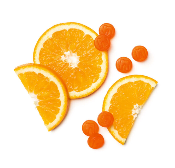 Ingredientes: Edulcorantes: jarabe de maltitol (FR), vitaminas (vit. C (ácido L-ascórbico), vit. D3 (colecalciferol), vit. E (acetato de DL-alfa-tocoferilo), vit. B1 (clorhidrato de tiamina), vit. B2 (riboflavina), vit. B6 (clorhidrato de piridoxina), vit. B12 (cianocobalamina), D-biotina, ácido fólico (ácido pteroilmonoglutámico), niacina (nicotinamida), ácido pantoténico (D-pantotenato cálcico)), gelatina, acidulante: ácido cítrico, aromas, colorante: carotenos, agente de recubrimiento: cera de carnauba.